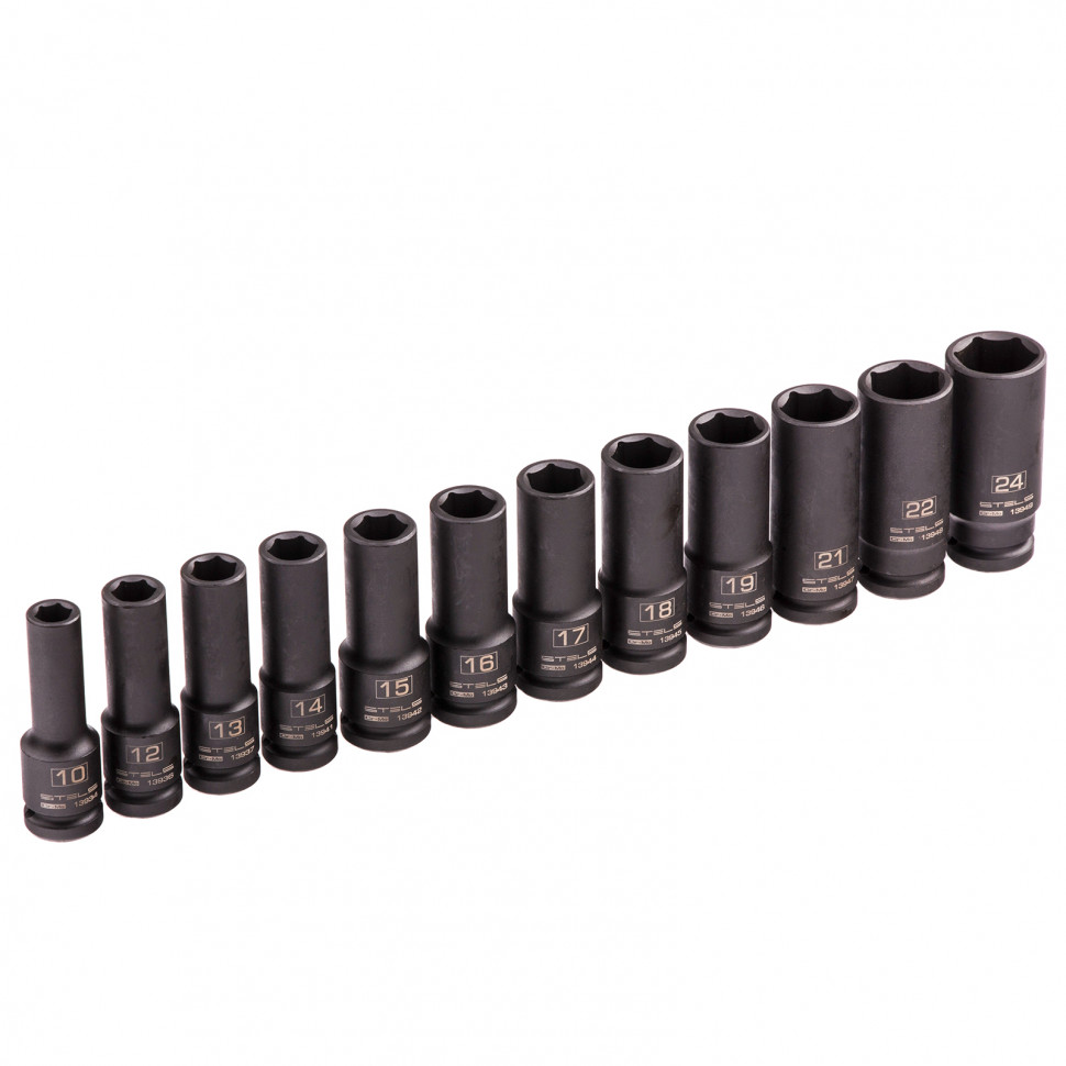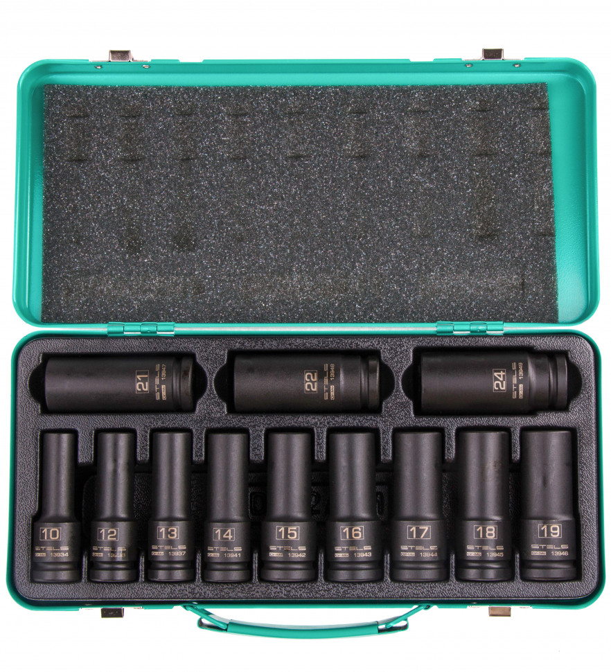 Набор ударных глубоких шестигранных торцевых головок Stels 13998 включает в себя 12 насадок размером 10-24 мм с присоединительным квадратом 1/2 дюйма. Ударные головки устанавливаются на гайковерт и выдерживают высокие динамические нагрузки, поэтому подходят для проведения строительных работ и обслуживания автомобилей.